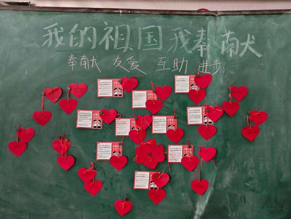 在“我的祖国我奉献”活动中,《每一个你》的歌声里,实践团成员分享中国志愿者的故事,孩子们听得专注,随后伏案写下心中对“奉献”的理解,又手绘祝福卡片,把纯粹的善意悄悄传递给中国志愿者。“薪火传九州,同拼中国梦”环节孩子们积极参与,课堂氛围持续活跃。省份接龙时,孩子们争相抢答,用童趣的联想记住一个个地名。铺开中国地图拼图,大家围拢协作,小心比对每一块拼图的位置,当完整的版图在眼前展开,稚嫩的惊叹声里满是对祖国疆域的好奇与热爱。同时,“知心姐姐的魔法信箱”静静立在角落,悄悄收纳着孩子们的小烦恼,又递出带着暖意的回信。