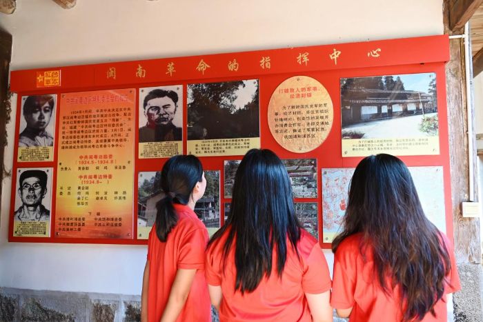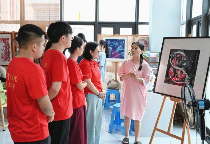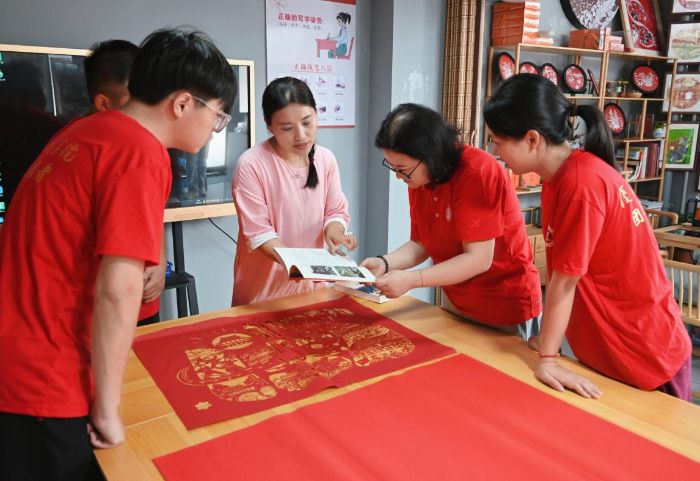 二、非遗剪纸焕新:让红色故事在指尖流转 漳浦剪纸非遗传承人陈敏蓉的工作室里,剪刀与红纸的碰撞声奏响传承序曲。她向队员们展示耗时一个月创作的《红辉映八闽》系列剪纸,作品以古田会议、晋江经验、闽南井冈山等元素为脉络,将福建红色历史与时代发展巧妙融合。