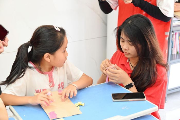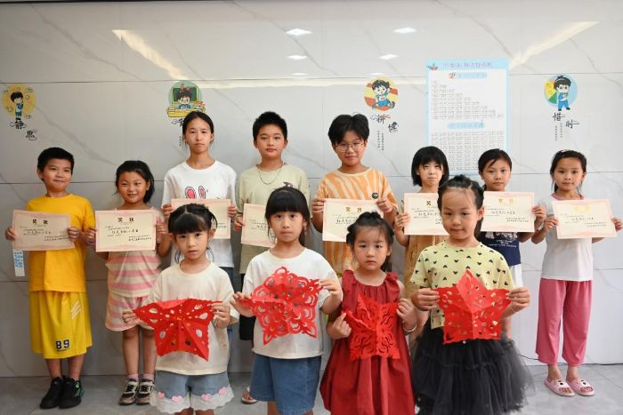 实操环节里,队员陈秋奕手把手教孩子们用“一刀剪”技法裁出一颗颗小红心。孩子们专注地握着剪刀,稚嫩的小手虽略显笨拙,却格外认真。剪好的红心被小心翼翼地贴在帆布包上,变成独一无二的“红色文创”。活动尾声,队员们为每位孩子颁发“红色剪纸小卫士”奖状,当孩子们举起奖状露出灿烂笑容时,红色传承的种子已悄然在童真心田扎根。