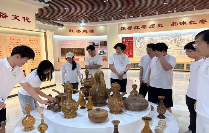 在文化展示环节,开热木拉·阿布都艾尼老师深入阐释红枣民俗文化,讲述红枣在新疆节庆、饮食、民俗中的重要象征意义。此外,还展示了古代用于盛放枣及制作枣制品的器皿,其中不乏造型精美的酒壶状容器。这些器皿不仅体现古人以枣酿酒、制酱的智慧,更承载着千年枣文化的厚重底蕴,让成员们深刻感受到红枣不仅是农产品,更是传承历史的文化符号。
