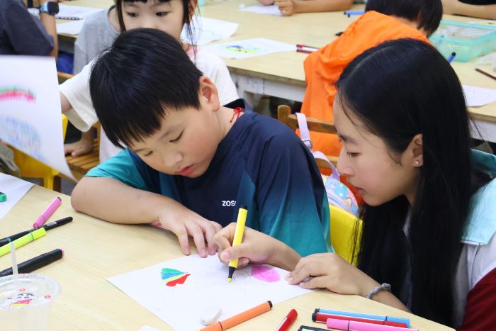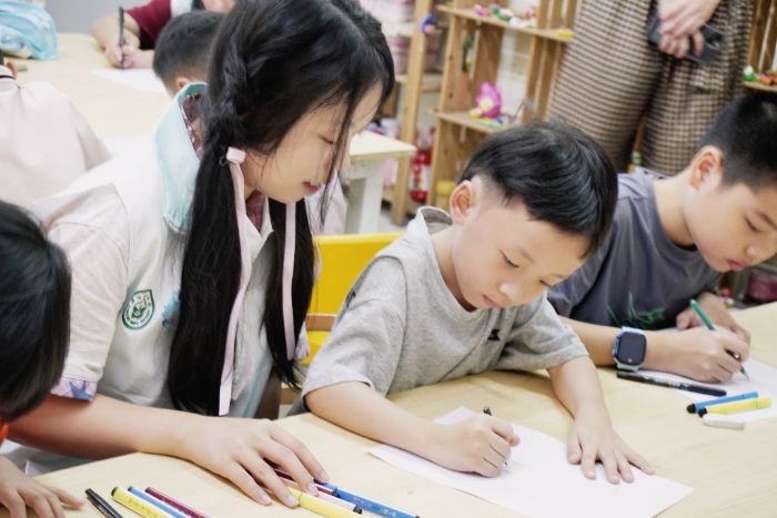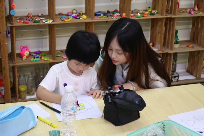 听完老师的介绍后,接下来是小朋友们动手实践环节。队员们为每个孩子准备了充足的绘画工具,并手把手地教他们如何描绘贝壳的外形,引导小朋友们发挥想象力,用不同的颜料创造出属于自己的艺术品,小朋友们都乐在其中,享受着自己创作的乐趣,笔下的每一件作品都充满了无限的童真和创意。