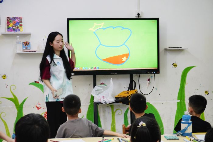 队员们耐心指导小朋友们绘画 雕情贝艺突击队摄