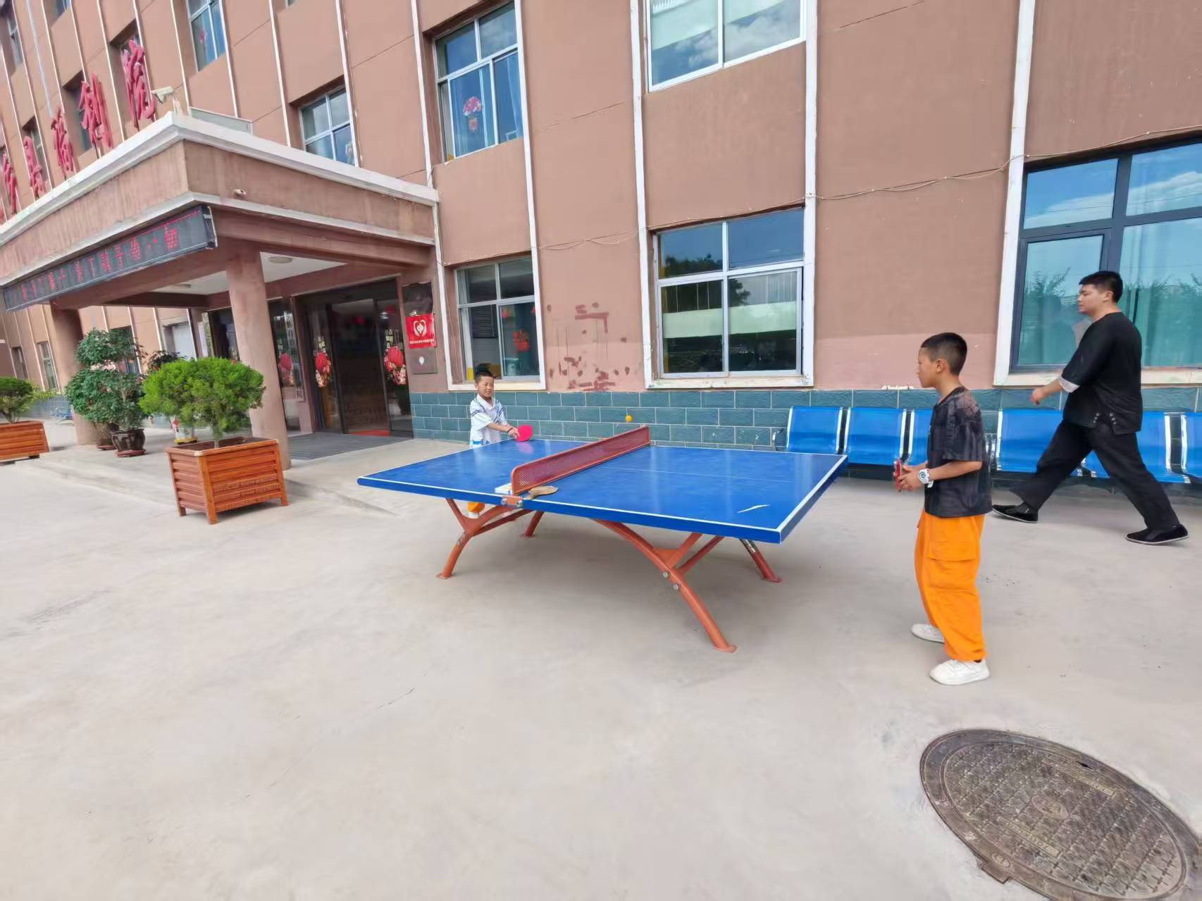 乒乓挥活力,篮球映暖光楼前空地上,亮蓝的乒乓球台边,志愿者和孩子们笑声不断。穿橙裤男孩追着球跑,志愿者轻挡逗他,满是欢乐。不远处篮球场上,志愿者抛球喊抢,孩子们像小鹿般奔去,球空心入网时,大家兴奋跳着欢呼。阳光照在孩子们红扑扑的脸上,喜悦与自豪洋溢,这温暖的画面成了福利院最美的风景。