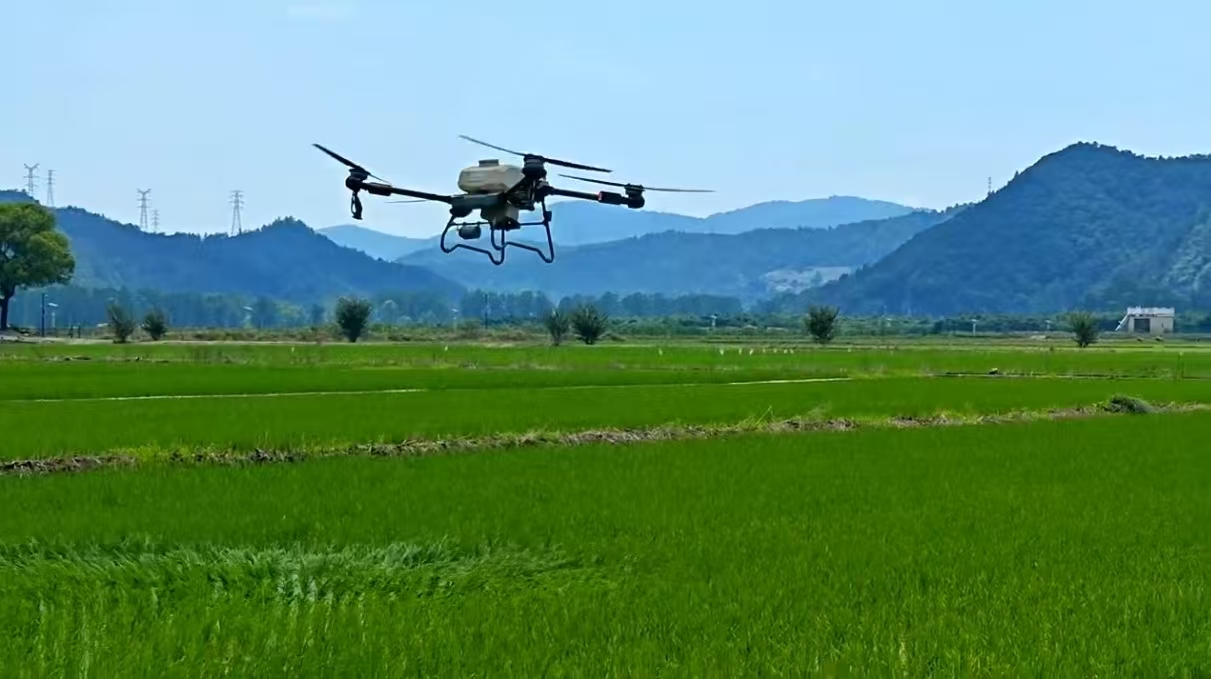来到桐庐县瑶琳镇姚村的千亩金花基地,暑气蒸腾的田垄上,几架银灰色无人机正以 3 米高度匀速巡航,螺旋桨搅动的气流将富含磷钾的叶面肥雾滴精准洒向水稻植株  —— 这是兴荣家庭农场负责人向毅的“每日任务”。