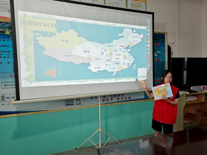 课堂上,实践队队员袁亚雪老师从孩子们熟悉的生活环境切入,以“大家知道我们克度镇在祖国的哪个‘小方块’里吗?”为话题,引发互动。随后,借助色彩鲜艳、标注清晰的行政区地图,将抽象的地理知识具象化,带领孩子们先找到贵州,最终锁定在孩子们的家乡——平塘县,再延伸至周边省份,逐步梳理中国34个省级行政区“大公鸡”版图的轮廓与分布,课堂上此起彼伏的“我找到啦!”声,迅速点燃学习热情。