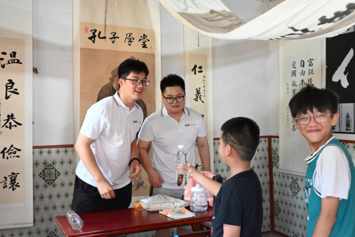 图为实践团成员在济水韶音博物馆的孔子学堂内开展“浮力”趣味科普实验。李忠哲摄