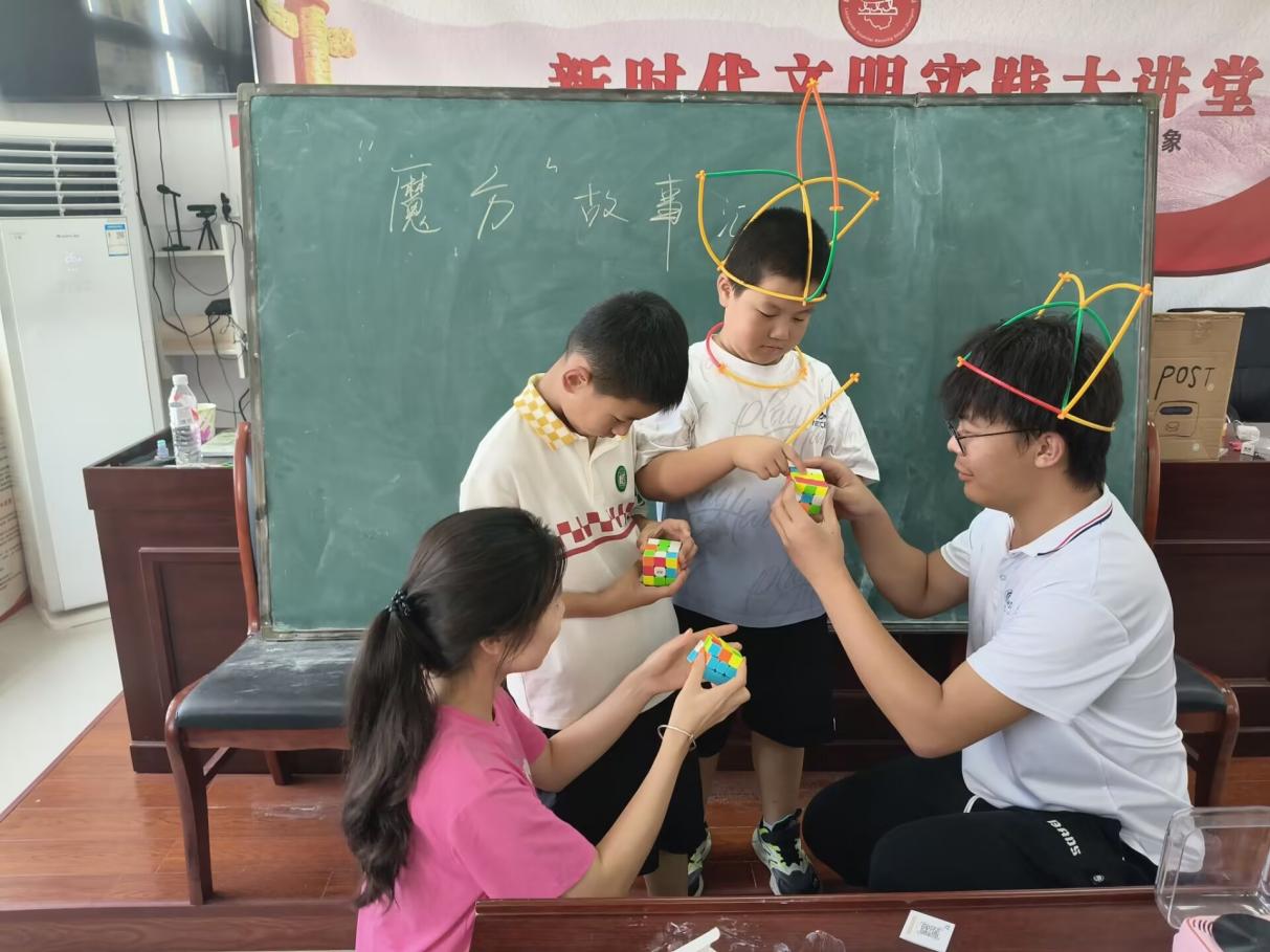 图为实践团成员带领孩子们拼魔方并分享故事。台可娜 供图