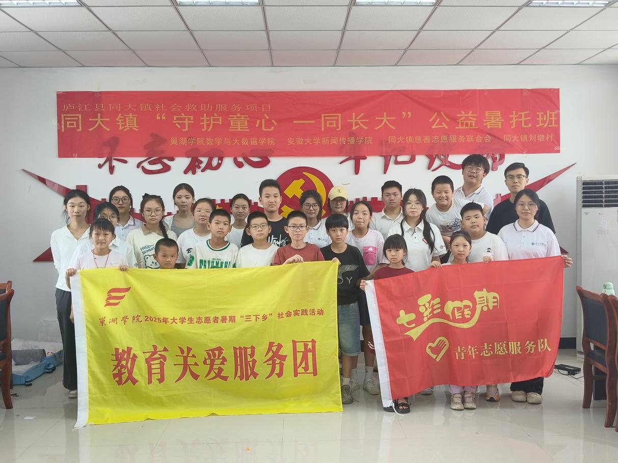 少年儿童是祖国的未来、民族的希望,文明的延续。为进一步教育引导青年学生在社会大课堂中争做有理想、敢担当、能吃苦、肯奋斗的新时代好青年,奋力书写为中国式现代化挺膺担当的青春篇章。2025年7月,巢湖学院“守护童心 一同长大”七彩假期志愿服务团赴庐江县同大镇开展志愿服务活动。志愿服务团始终怀揣着对乡村教育的热忱,精心策划并开展七类特色课程,用青春力量为当地儿童打造充实有趣的假期,以实际行动为乡村教育添砖加瓦。