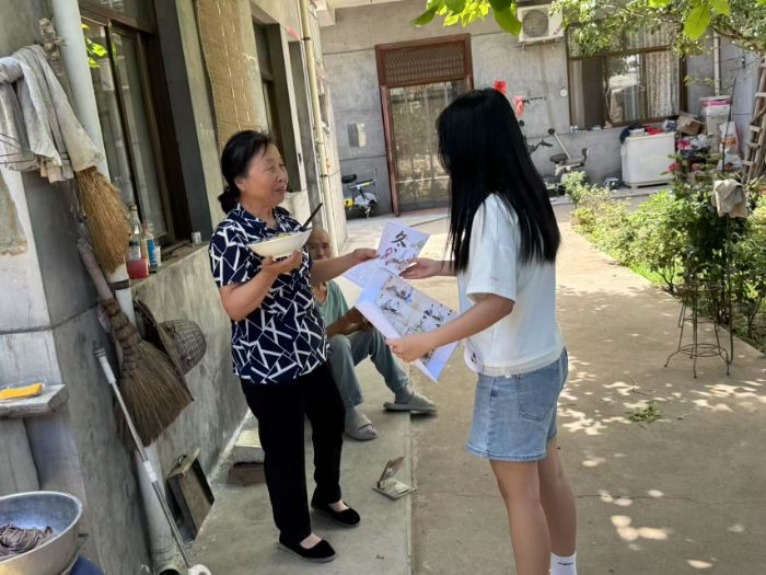 在卢五桥村、牛东村,实践团成员怀揣调研问卷,倾听村民对文化生活的期待,将美育的种子播撒在交谈与笑语之间。指导教师与村干部围桌畅谈,聚焦“党建+美育”模式在社区治理中的应用。村干部详细介绍了村里在党建引领下,通过文化活动增强村民凝聚力、提升社区文化氛围的实践与挑战。双方还就“一老一小”的美育需求进行了深入探讨,为实践团的调研指明了方向。同时,实践团依托陕西职业技术学院中医药文创设计省级技能大师工作室的优势,为老人们准备了“艺暖银龄·安康相伴”宣传彩页,普及健康养生知识。队员们用通俗易懂的语言,为老人们讲解日常饮食、运动锻炼、心理健康等方面的知识,赢得了老人们的称赞与感谢。