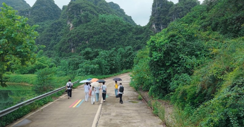 7月14日,队员们前往峰林晓镇,调研当地自然景观与人文设施的融合情况。在“峰来运转”巨石旁,木质水轮车缓缓转动,带起的水雾经阳光折射形成彩虹;正值荷花盛放期,队员们乘小舟穿行荷塘,荷香混着水汽弥漫,蜻蜓点水、鱼戏莲叶的场景展现出盎然生机。午后沿木板小径行走,两侧针茅随风起伏,“漫天飞仙”装置在风中轻摇,与远处峰林形成独特景观。