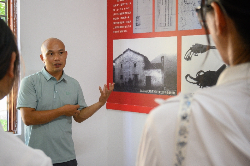 7月15日,突击队走进红色古村落金造村,探访革命遗址。在罗发故居,泛黄的报纸、斑驳的照片与陈旧的荣誉证书,记录着这位革命先辈的生平事迹:1944年投身抗日,1945年加入中国共产党,参与东江纵队斗争,1949年组织九龙金造起义,转业后深耕农业科研,离休后仍心系老区振兴。革命历史展厅内,墙上的战况记录与玻璃柜中的枪械、文件,还原了九龙起义与金造保卫战的历史场景。