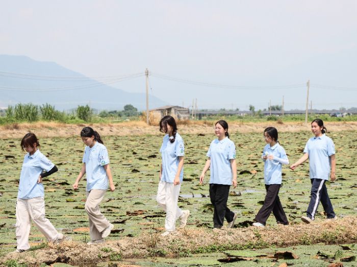 图为肇庆学院“芡”途似锦突击队漫步于芡实种植地田埂间。骆璇供图