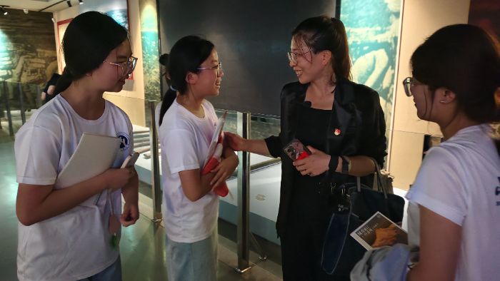 图为团队对孟良崮纪念馆讲解员进行采访 贾思雨摄
