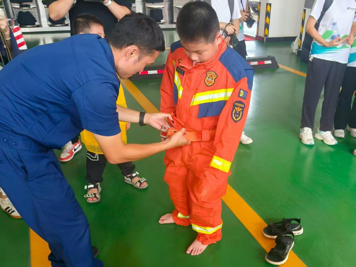 活动伊始,丁队长带领孩子们走近一排排整齐陈列的消防“战袍”与“利器”。他依次拿起装备,声音洪亮地介绍:“这是火灾现场战斗服,能抵御高温烈焰;这是抢险救援服,轻便灵活,适合复杂环境;那套黄色的防风服,是摘除马蜂窝时的‘金钟罩’。”当展示到不同级别的防护装备时,孩子们发出惊叹:“二级防化服配上专用面具,能防化学污染;而重级防化服加上呼吸器,就像一个小型移动安全舱,保护消防员叔叔进入最危险的地方。”