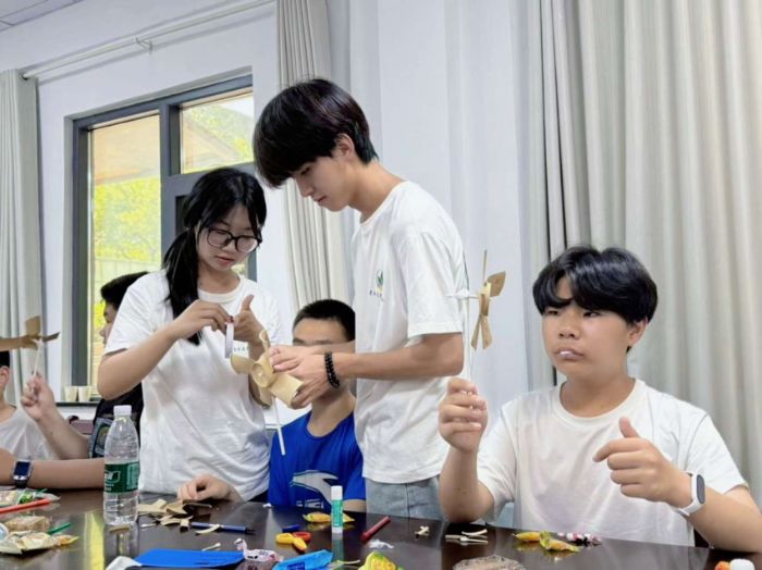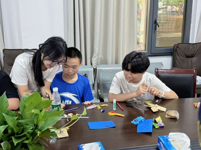 理论落地,实践先行。志愿者引导青少年将旧纸板、杯子、吸管等塑料制品,通过剪、折、画、粘等步骤,巧妙地变身为旋转的风车。队员刘美佳、万家玉对孩子们的创造力印象深刻。在教授用旧纸杯制作风车的过程中,她们深切体会到:“实践让孩子们对‘节约’和‘再利用’有了全新且深刻的理解,其效果远胜于单纯的说教。”孩子们奇思妙想的创作过程,不仅锻炼了动手能力,更将“资源循环”理念具象化,使其直观感受到环保的价值。队员潘兰贞和余俊兵看到孩子们抱着亲手制作的作品高兴地离开,相信这份喜悦和学到的环保知识必将传递得更远。