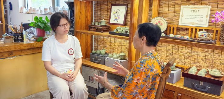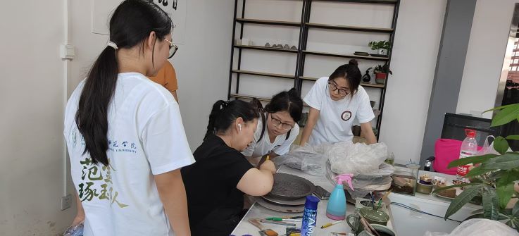 团队与多位耀州窑陶瓷烧制技艺非遗传承人进行深入交流,耀州窑青瓷恢复第一代刻花大师张夏珍在接受实践队采访时感叹:“耀州青瓷的恢复从来不是一个人的功劳,是所有人没日没夜努力的结果。”朴实的话语让队员们体会到非遗传承背后的艰辛。队员们还尝试用瓷土捏制泥胚,指尖与陶土揉搓的瞬间,队员们更加深刻体会到每件瓷器都承载着匠人的坚守和传承的力量。