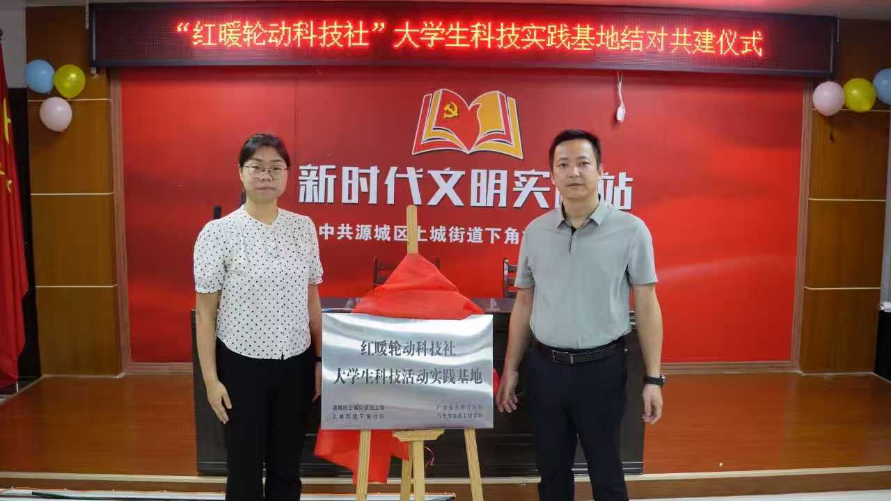下午,广东技术师范大学汽车与交通工程学院与河源市源城区上城街道团工委、下角社区居委会三方共建“红暖轮动科技社大学生科技实践基地”签约揭牌仪式在下角社区举行。学院党委副书记邝绮琳、上城街道党工委副书记陈景力等领导出席见证。