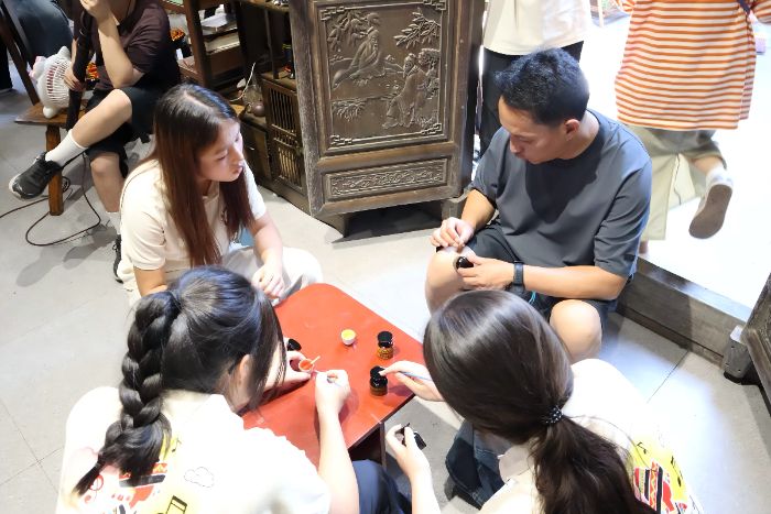 讲解之余,吉伍五呷老师亲自示范了彝族漆器制作的核心工序,将匠心具象呈现。从精选优质木材、精心制胎塑形,到繁复精细的髹漆,再到最后的纹样描绘,每一步都是对匠人耐心与技艺的极致考验。“单是髹漆这道工序,”吉伍老师一边用特制的细毛刷均匀涂抹着天然漆料,一边叮嘱道,“就需要反复上七八层之多。每一层都必须置于特定环境中自然阴干,耗时数日,急不得,也马虎不得。”漆器之美,正是在这时间的沉淀与匠心的坚守中悄然绽放。