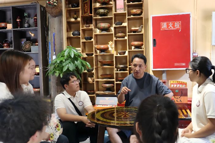 在老师的指导下,团队成员尝试绘制简单的彝族纹样。初次握笔的手难免颤抖,线条歪歪扭扭,但大家都学得格外认真。当看到自己笔下的羊角纹、火塘纹逐渐在漆盘上成形,龚曦赟感慨道:“原来一件小小的漆器,背后是这么多道工序和这么深的文化密码。这不仅是手艺,更是彝族人民一代代传下来的精神财富。”