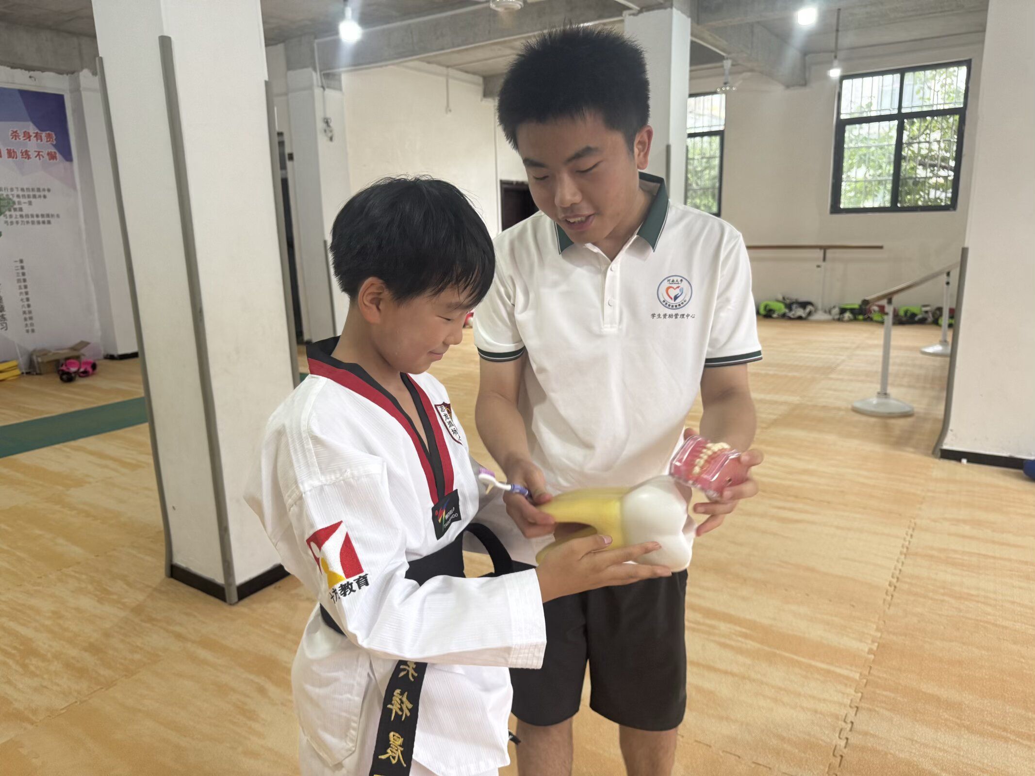 14日,队员们发挥专业优势,深入竹沟镇各处开展口腔科普。在镇政府办公室,PPT动画将“错𬌗正畸”(牙齿矫正)原理形象化为“牙齿变形记”,普及科学正畸及日常护理知识;在养老院开设“义齿护理工坊”,为老人讲解护理方法,分发牙刷并示范牙线使用;在跆拳道馆,结合运动防护向孩子们科普牙齿构造与龋齿成因;同时沿街发放科普宣传页。本次科普宣传活动覆盖不同年龄群体,团队成员们以专业和热情守护当地村民的健康与笑容。