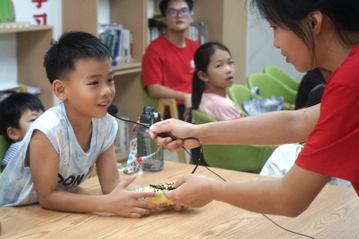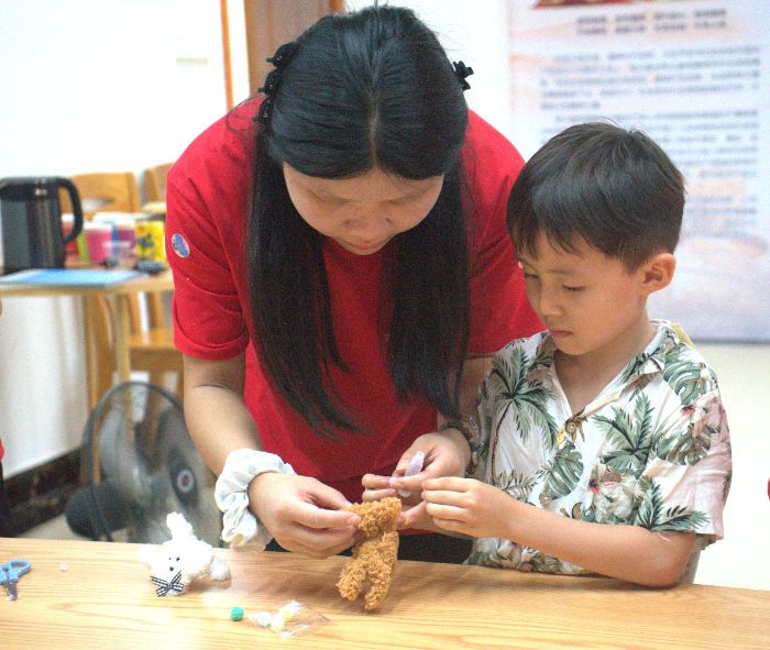 在扭扭棒创意课堂上,孩子们化身小小艺术家,专注地将彩色棒条弯折缠绕。实践队员俯身指导,手把手帮助年龄较小的孩子调整角度。当立体的五角星在一个孩子掌心闪耀时,他眼中绽放出自豪的光芒——这一刻,红色基因在指尖传承。