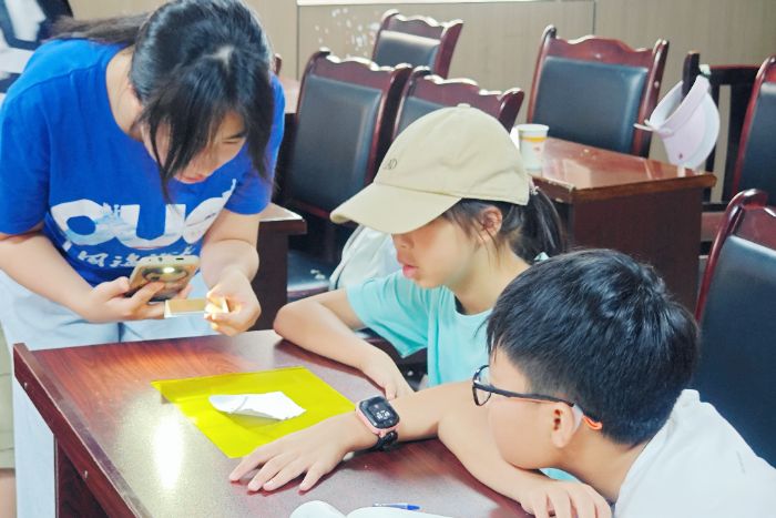 图为实践团成员带领小朋友通过三棱镜感受光的色散。杨洋摄