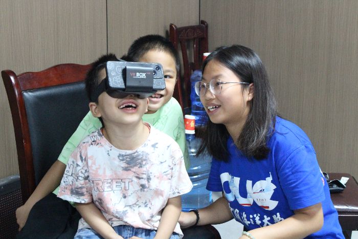 图为小朋友体验VR眼镜。简雨珍摄