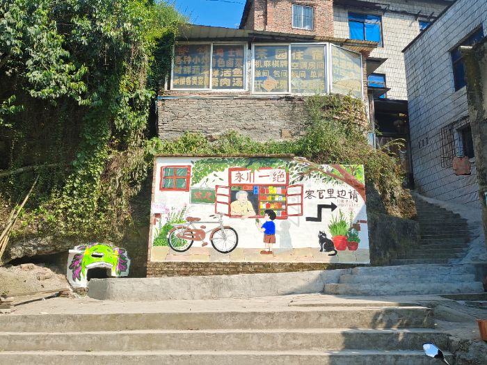 “乡村振兴既要塑形,也要铸魂”,实践团以“老墙焕新”行动激活乡村文化生命力。队员们顶着盛夏烈日,深入凉风洞农家乐及老旧街区,清理斑驳墙面、铲除松动墙皮。创作中深挖永川本土文化,将滑肉汤的市井烟火、活鱼的灵动神韵等元素融入画作,让旧墙面蜕变为承载乡土记忆的文化景观。画笔舞动间,不仅为乡村添彩,更搭建起连接传统与现代的文化桥梁,以艺术赋能乡村文化振兴,践行“把论文写在祖国大地上”的实践理念。