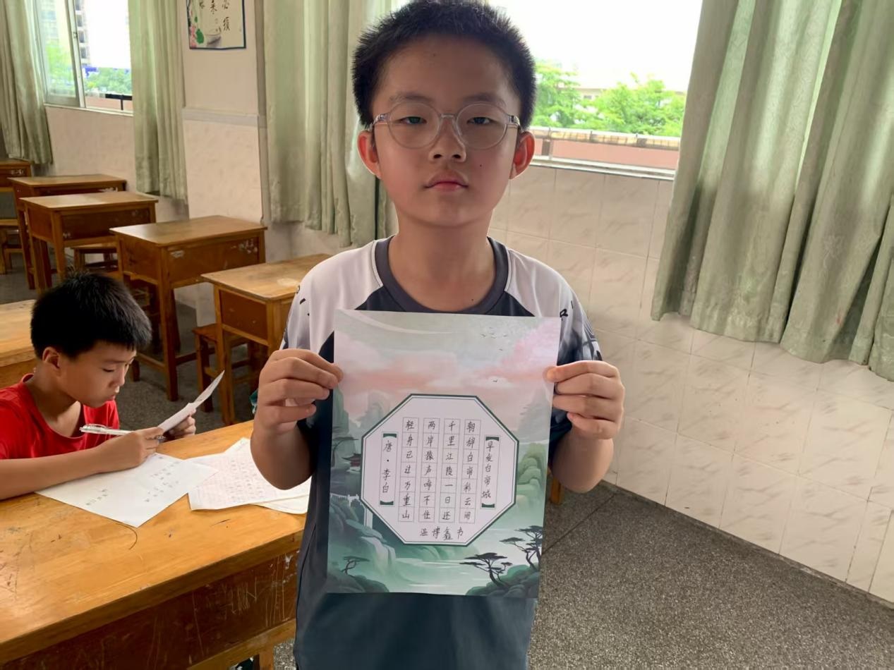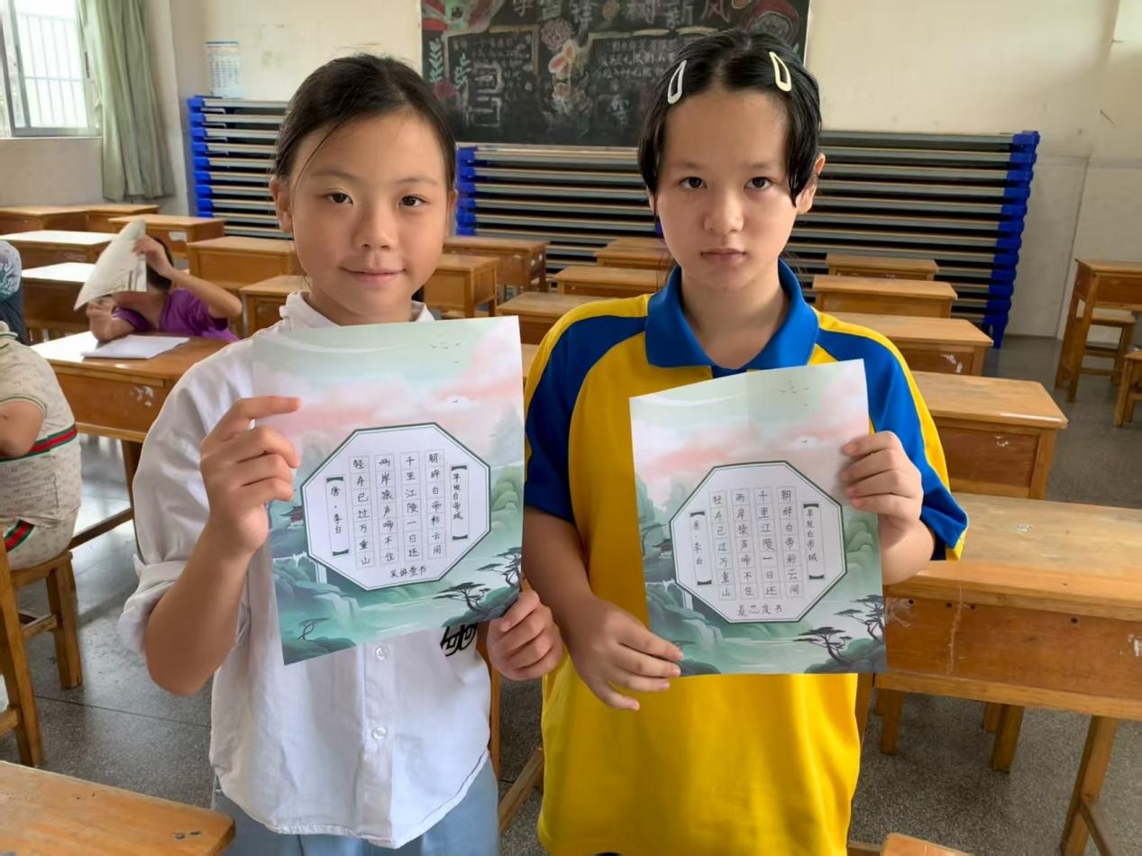 书法课则聚焦汇演展示作品,选定古典诗歌《早发白帝城》等作为主题。老师们以重点字为例教授学生偏旁部首的规范书写以及汉字的间架结构,提升其对字形的整体把握能力。同时两位教师一一对学生的练习进行面对面指导与纠正。值得一提的是,有三名学生主动要求加练,这让老师们倍感欣慰。