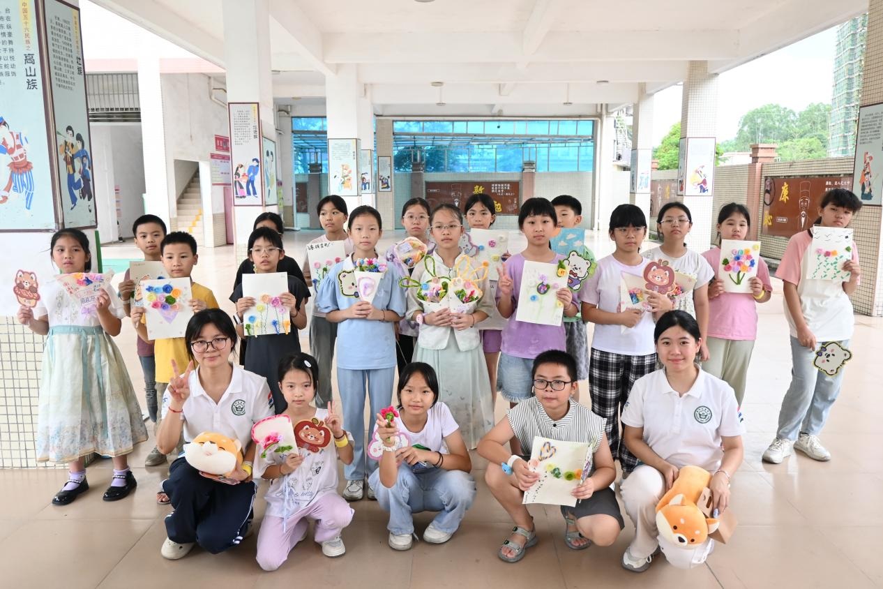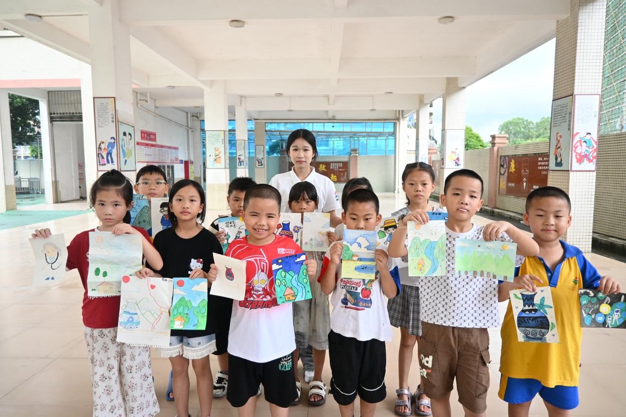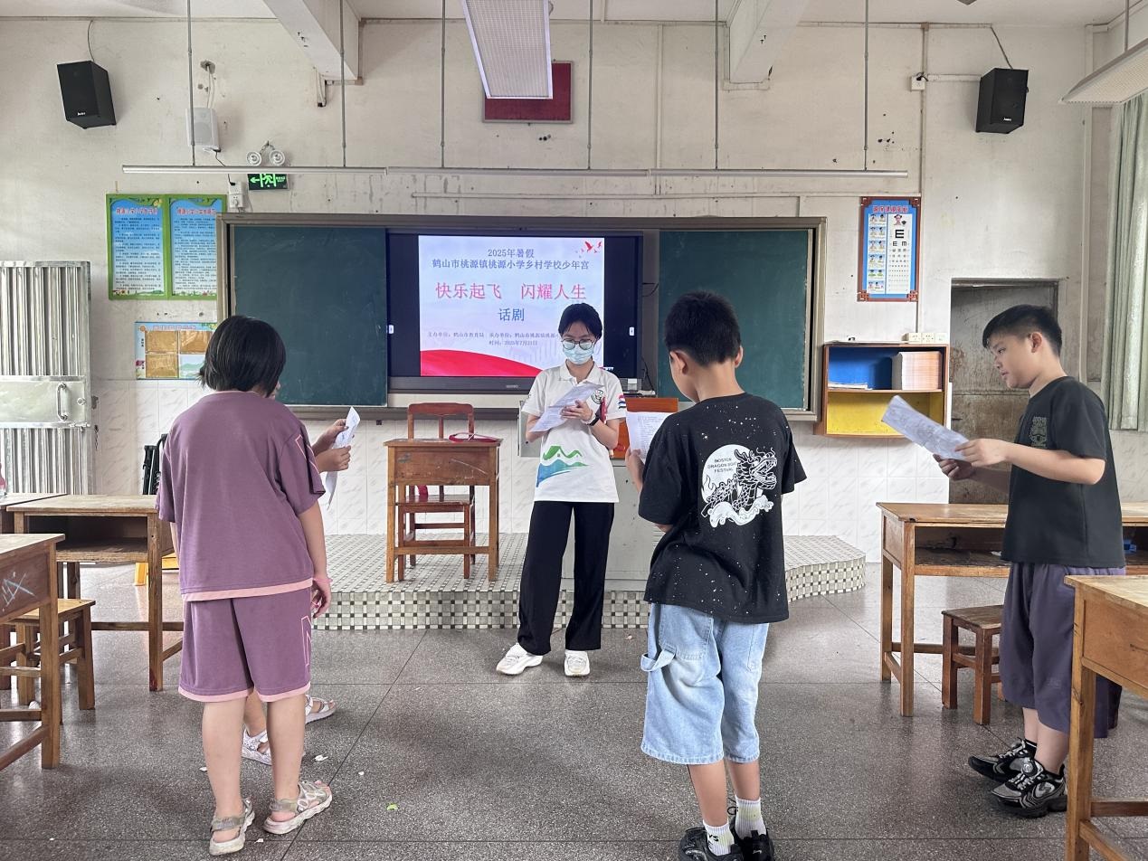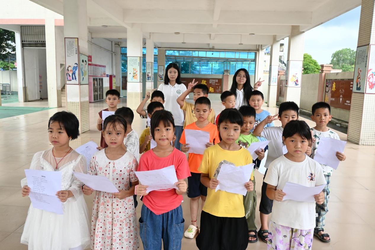 为深入贯彻国家《“十四五”乡村教育振兴行动计划》中“推动优质教育资源下沉乡村”的部署,响应共青团中央“三下乡”社会实践号召,2025年7月16日至7月23日,广州新华学院中文系分身剧社突击队深入广东省鹤山市桃源镇桃源小学,开展了为期八天的“艺术侵润童心”美育支教活动。尽管面临台风和暴雨的双重考验,团队仍以灵活调整和加倍热情,通过系统化的书法、手工、话剧、绘画、朗诵艺术课程设计,为孩子们带来了一场难忘的,充满韧性、创意与温情的美育之旅。