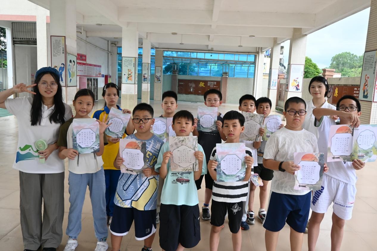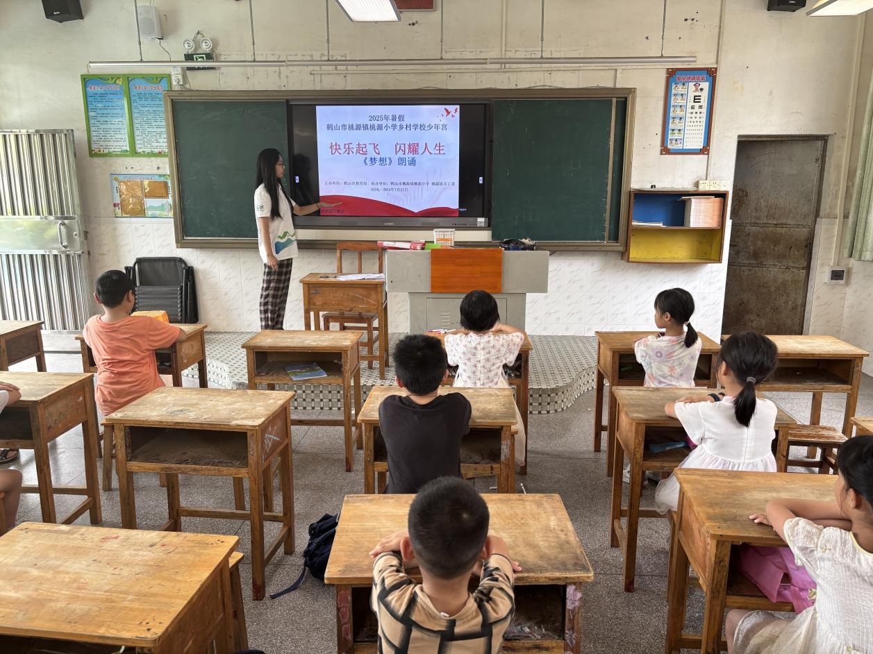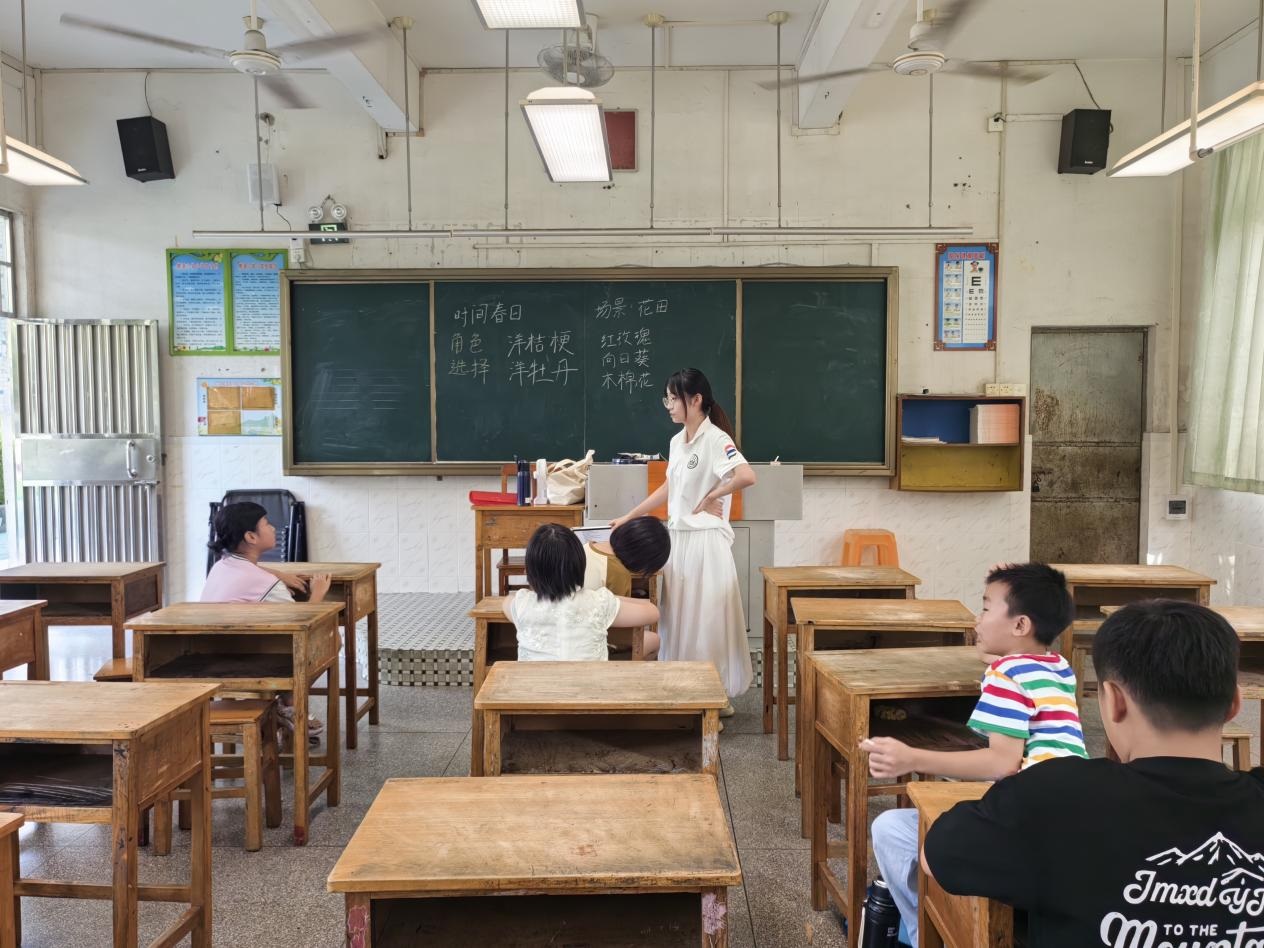 为深入贯彻国家《“十四五”乡村教育振兴行动计划》中“推动优质教育资源下沉乡村”的部署,响应共青团中央“三下乡”社会实践号召,2025年7月16日至7月23日,广州新华学院中文系分身剧社突击队深入广东省鹤山市桃源镇桃源小学,开展了为期八天的“艺术侵润童心”美育支教活动。尽管面临台风和暴雨的双重考验,团队仍以灵活调整和加倍热情,通过系统化的书法、手工、话剧、绘画、朗诵艺术课程设计,为孩子们带来了一场难忘的,充满韧性、创意与温情的美育之旅。