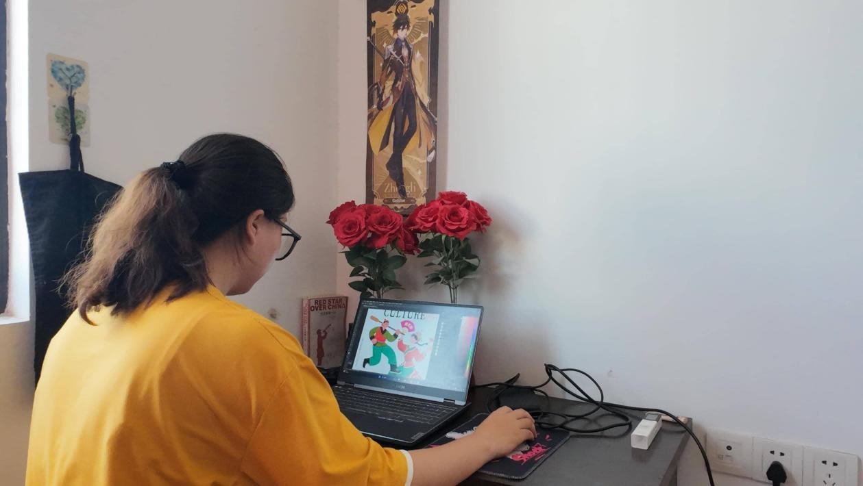 图为实践队员进行设计盱眙花船动态海报的过程 闻清摄