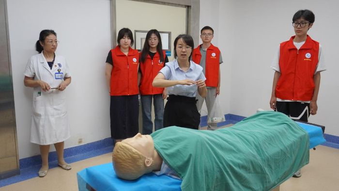 随后,实践团参与临床手术知识培训环节。在模拟手术室,医护人员以高仿真手术假人为教具,细致讲解一台外科手术的完整流程,从术前消毒、器械准备,到切口设计、组织分离,再到止血缝合、术后处理,每一个步骤都配合假人模型的解剖结构进行具象化演示。实践团成员围站在操作台周围,认真观察医护人员的操作流程。通过这种理论讲解与假人模拟操作相结合的方式,同学们不仅直观了解了手术的规范流程,更对医疗工作者严谨细致的职业素养有了深刻体会,为今后理解医疗服务流程积累了生动素材。