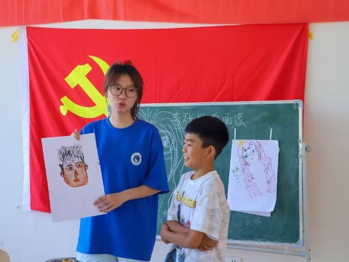 美术教育在支教活动中具有独特价值,它不仅能够激发乡村孩子的创造力与想象力,更通过艺术表达帮助他们建立自信、开拓视野。在甘洛普昌中学国防教育基地支教第三天,一场“夸张的画像”美术课正悄然开启孩子们的艺术之门。铺开雪白画纸,调好缤纷水粉,“今天我们不只是画普通的肖像,”队员冷蔼媛微笑着举起画笔,“而是要探索一种让画面会说话的魔法——夸张的艺术手法!”队员张艺凡随即在黑板上示范:忽而勾勒出头发长得能跳绳的人物,忽而描绘眼睛大如铜铃的脸庞,生动的范例引得孩子们阵阵惊叹。创作环节中,志愿者们穿梭于课桌间,时而俯身指点技法,时而鼓励大胆创新。二十分钟后,孩子们自信地展示作品:有用螺旋线条表现自然卷发的同桌,有用五角星大小眼镜突出老师特征的肖像,更有将志愿者标志性笑容画得照亮整张画纸的创意之作。教室里此起彼伏的“这是我画的你!”的欢叫声,与空气中弥漫的水彩清香,共同构成了这堂艺术课最美的风景。