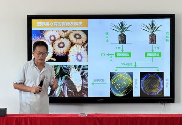 为让助农内容“接地气”、直播“有底气”,寻迹实践团系统开展了深度田野调研,重点走访了华南农业大学驻徐闻工作站的示范基地牛哥驿站,与工作站主任姜峰院长就菠萝种植模式优化、病虫害综合防治以及种苗培育技术等核心议题进行了专业研讨。调研发现,当地通过推广抗病优良种苗及智能水肥一体化系统的应用,已使黑心病发生率显著降低;同时,产业链后端加工企业通过完善冷链物流体系、提升精深加工能力,正推动菠萝产业从初级农产品向高附加值商品转型,初步形成了"种植-加工-销售"一体化的全产业链发展格局。