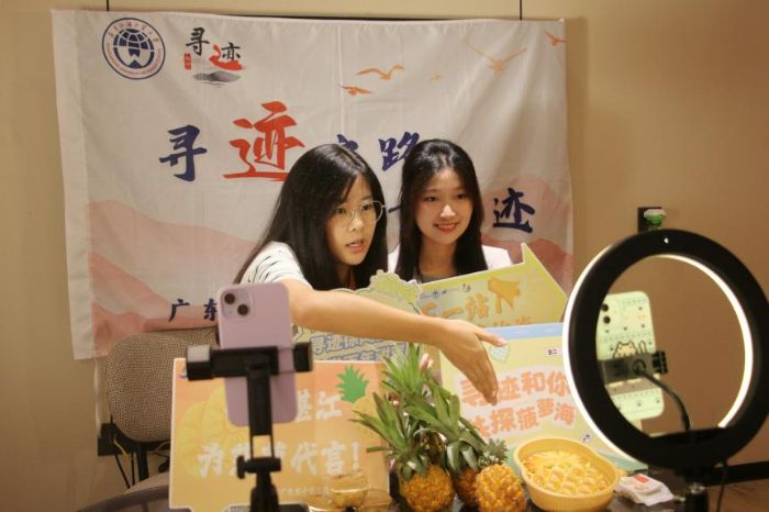 “朋友们看这个菠萝酥,金黄色的菠萝果肉纤维看得见,一口咬下去奶香味十足。”在精心打造的百千万工程助农直播间里,来自广东外语外贸大学的寻迹实践团成员们正以专业又接地气的讲解,推介菠萝酥、菠萝月饼等徐闻特色农产品。
