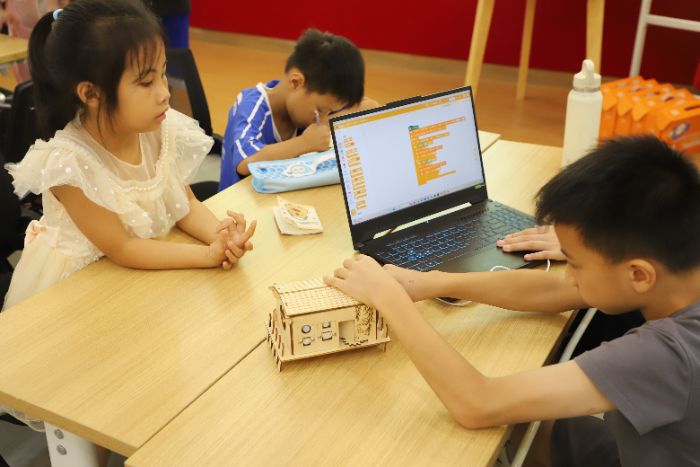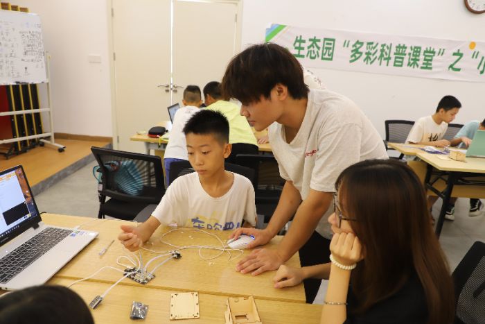 2025年7月,在东莞市生态雨阳光雨党群服务中心,广东科技学院“非遗筑梦”突击队为社区小学生们带来了一场妙趣横生的编程体验课。孩子们在队员的带领下,从基础指令学起,亲手设计“定时炸弹”倒计时、搭建“感应门”交互逻辑,用代码编织创意,在趣味实践中触摸科技的温度。