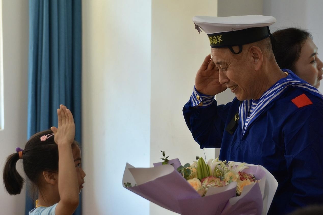 (图为儿童代表向退役海军献花)