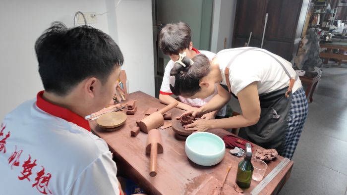 图2为成员们在老师的指导下制作紫砂壶。周凡琳供图