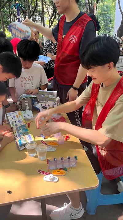 二、社区宣传联动,守护安全你我他 与此同时,第二队志愿者在社区广场开展用电安全宣传。当天上午8时,志愿者到达现场布置宣传展板、实验台与互动区域,并准备实验材料、宣传册和小型奖品等物资。