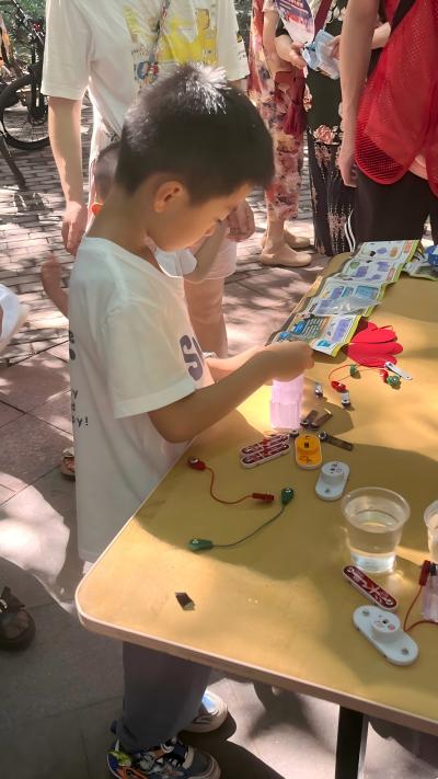 - 人体导电实验:孩子们在志愿者的带领下,通过接触导电片点亮灯泡,并集体围成闭合电路形成大圈,验证人体导电现象。