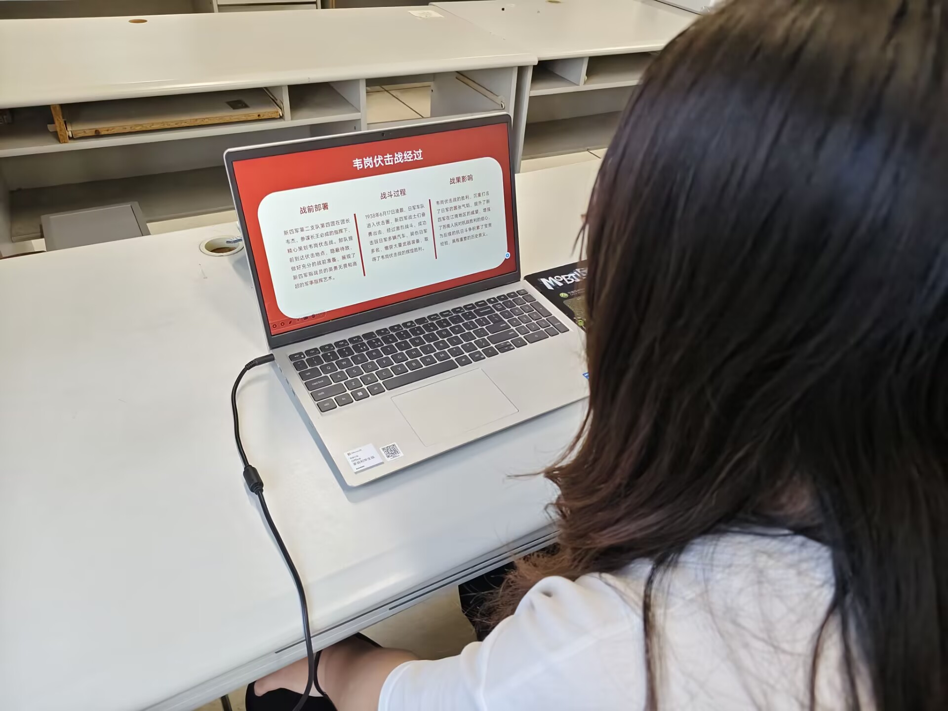 图为实践团成员们仔细学习韦岗首战告捷后的社会影响。王智祥 供图