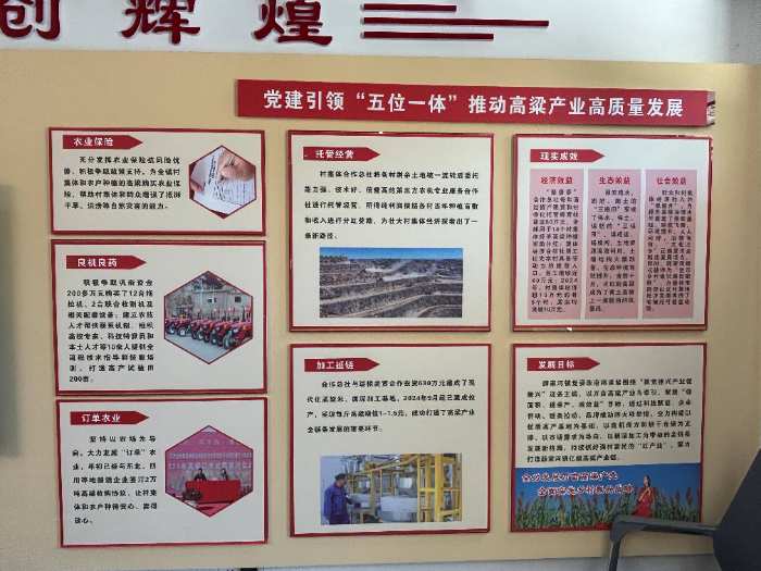 党建引领赋能高粱种植产业发展是薛家河镇的“金点子”。在薛家河村党群服务中心,实践队员们参观了高粱产业合作总社,深入了解了党建引领“五位一体”的产业发展模式。据总社负责人介绍,薛家河镇在高粱产业初期,就由薛家河镇党委牵头,联合14个行政村组建高粱产业联合党支部,有效解决了人心散、资源散、市场散的难题。