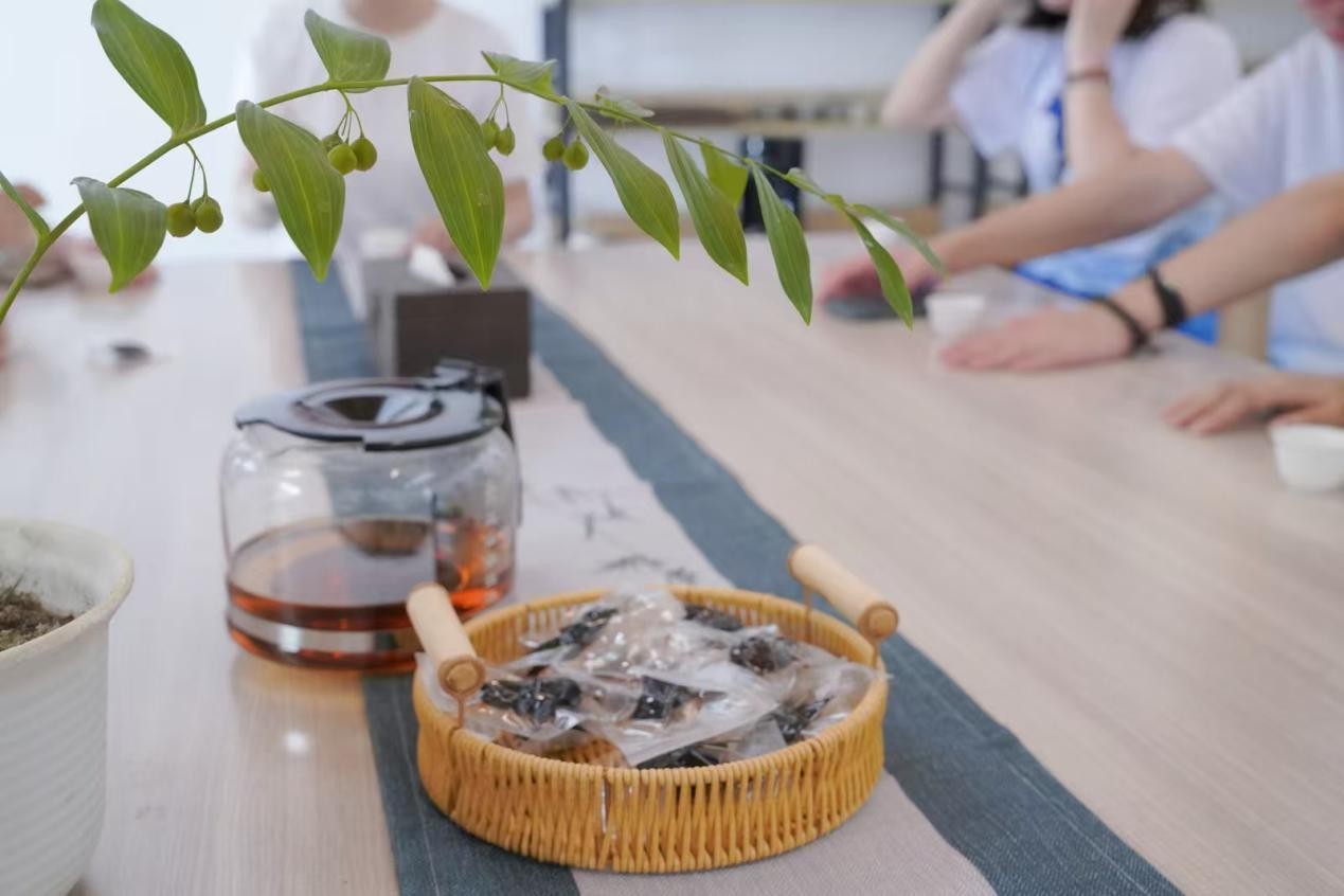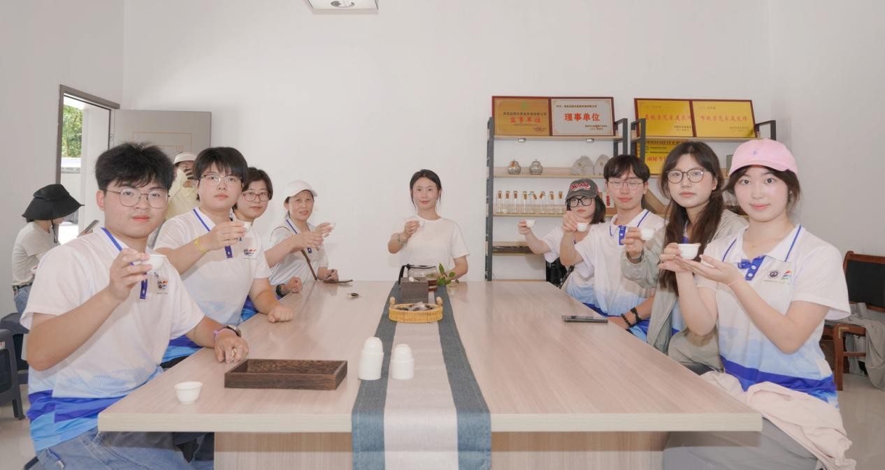 图为基地负责人和实践团成员品尝黄精茶 张振宇 供图
