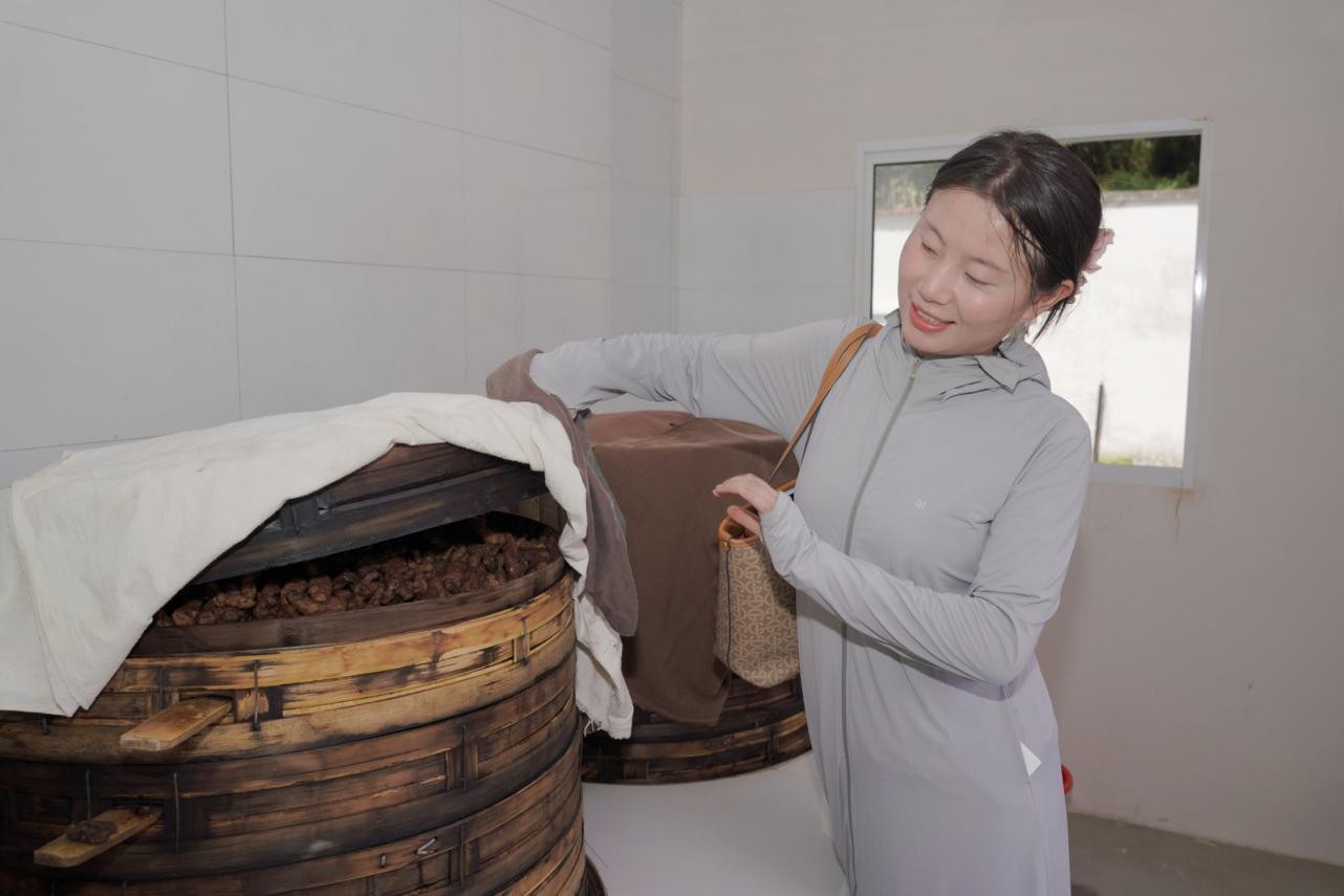 图为实践活动的基地负责人为实践团展示正在进行加工的黄精 张振宇 供图