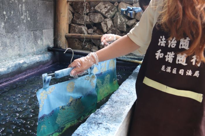 在非遗传承人张婷婷老师的带领下,实践队员体验布依族独特的豆染技艺,她细致示范基本工具使用方法以及制作工序。随后,队员们与张婷婷老师一起制作方巾,队员们在豆染的过程中深切体悟了传统非遗豆染的匠心独运,坚定了保护与发扬非遗传统文化的信念。