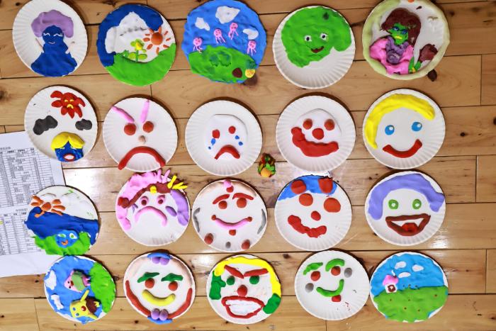接下来,两位老师拿出了粘土和纸盘。“你们知道吗?情绪也能被看见。”老师启发孩子们用粘土“画”出情绪。“生气可以用红色的粘土来表达,开心则可以是明亮的黄色……”她们轻轻按压粘土,一张大大的笑脸浮现在纸盘上。