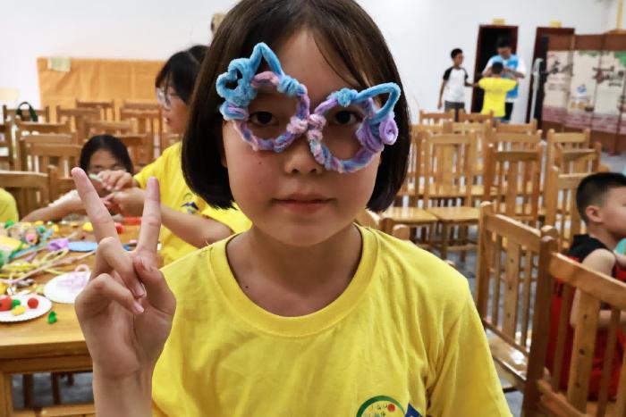 两位老师的心灵手巧使大家崇拜不已,在孩子们眼中,老师的扭扭棒就是充满魔力的魔术棒。“我要在眼镜框上加蝴蝶结!”“我想要做粉红色的!”孩子们踊跃尝试,小手灵活翻飞。很快造型各异的扭扭棒眼镜就出现在了他们的脸上。