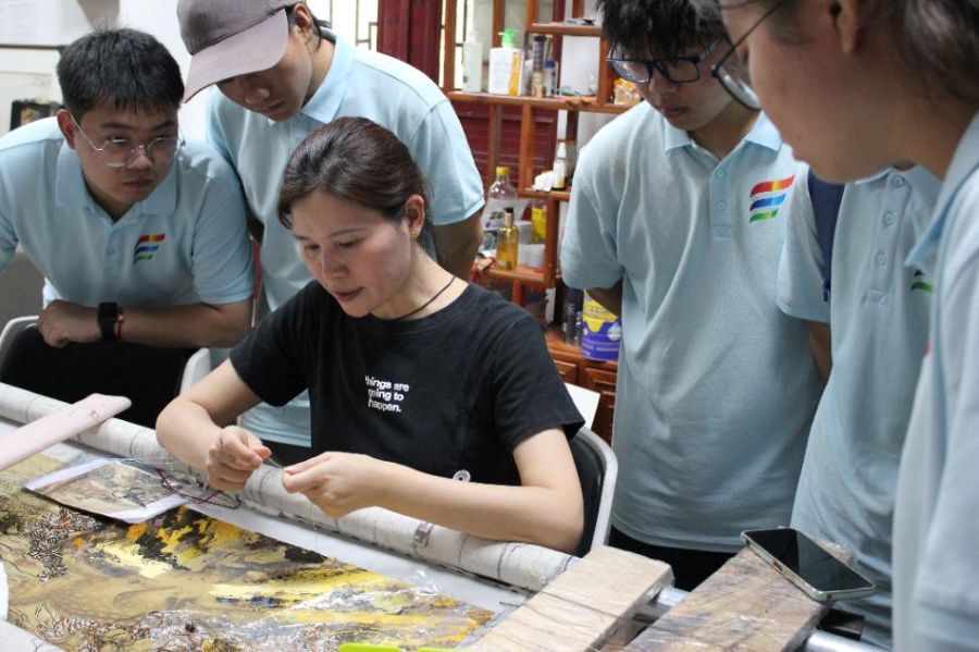 图为实践团成员观赏绣制嫁花过程。彭艺摄