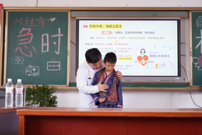 讲解结束后,医护人员邀请两名学生分别扮演施救者与患者,在其全程指导下完成完整操作演练:从判断异物卡喉状态,到实施针对性挤压或拍击动作,现场再次直观呈现急救流程,让抽象知识点转化为具象操作能力。